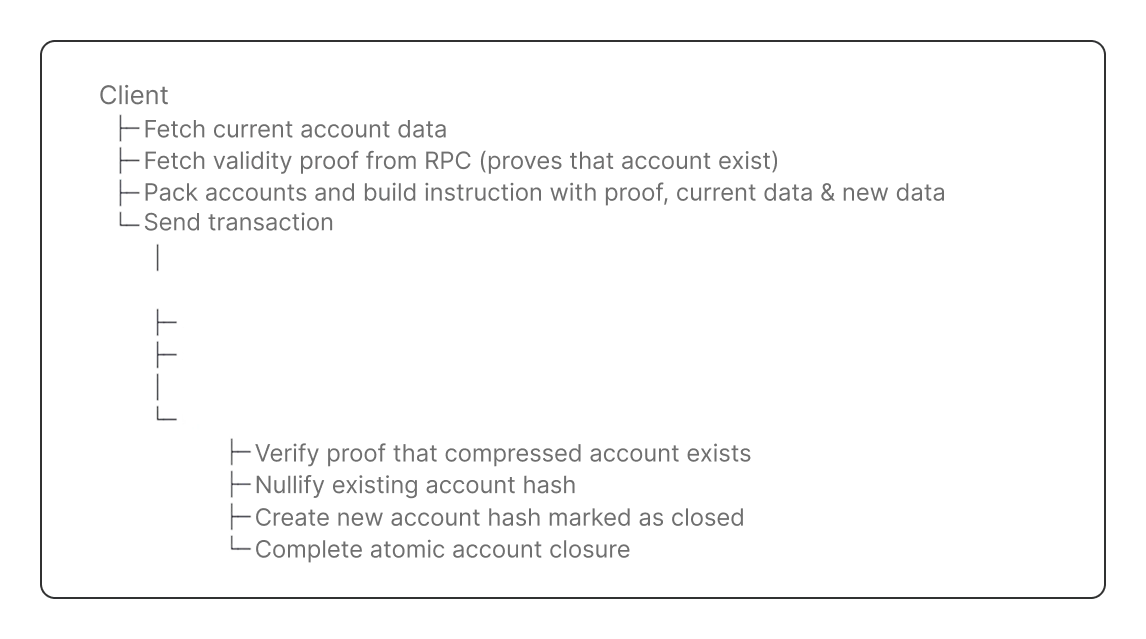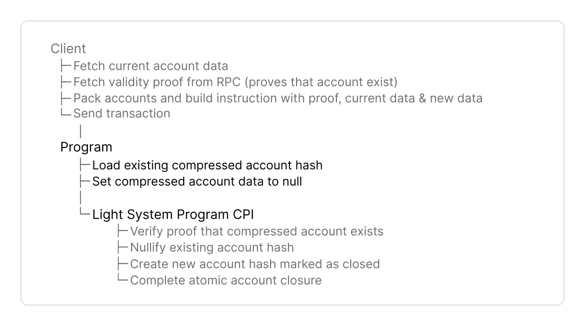 This guide will cover the components of a Solana program that closes compressed accounts. Here is the complete flow to close compressed accounts: