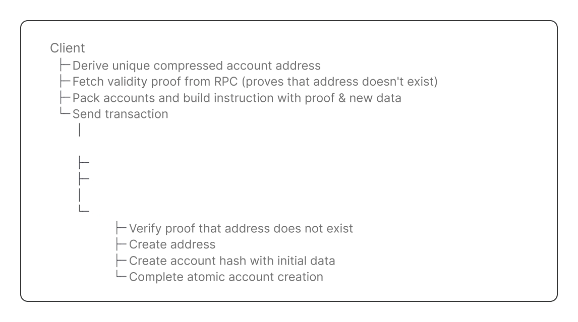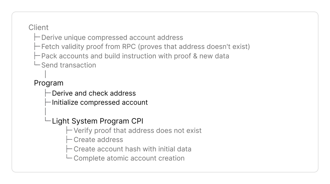 This guide will cover the components of a Solana program that creates compressed accounts.Here is the complete flow: